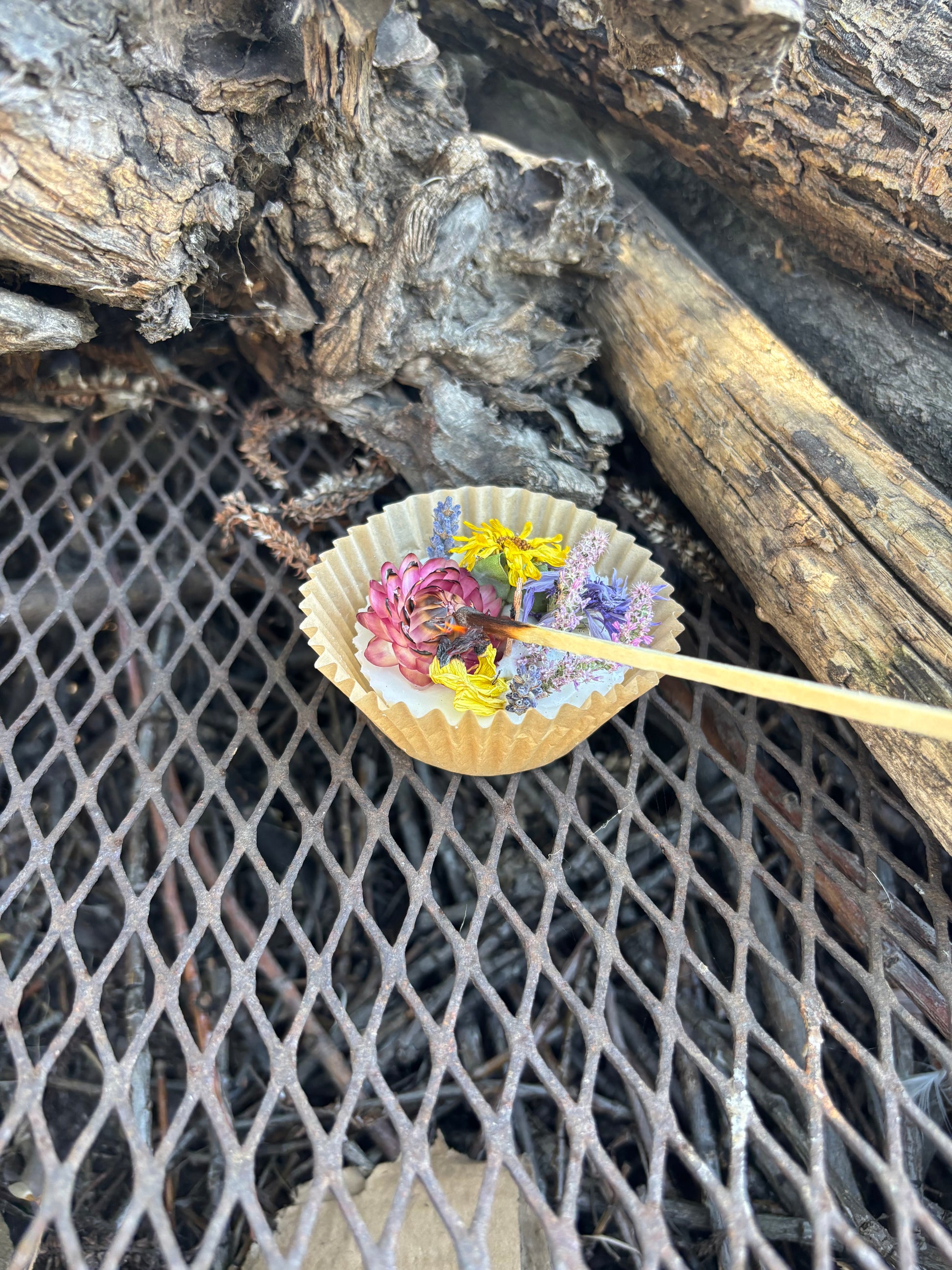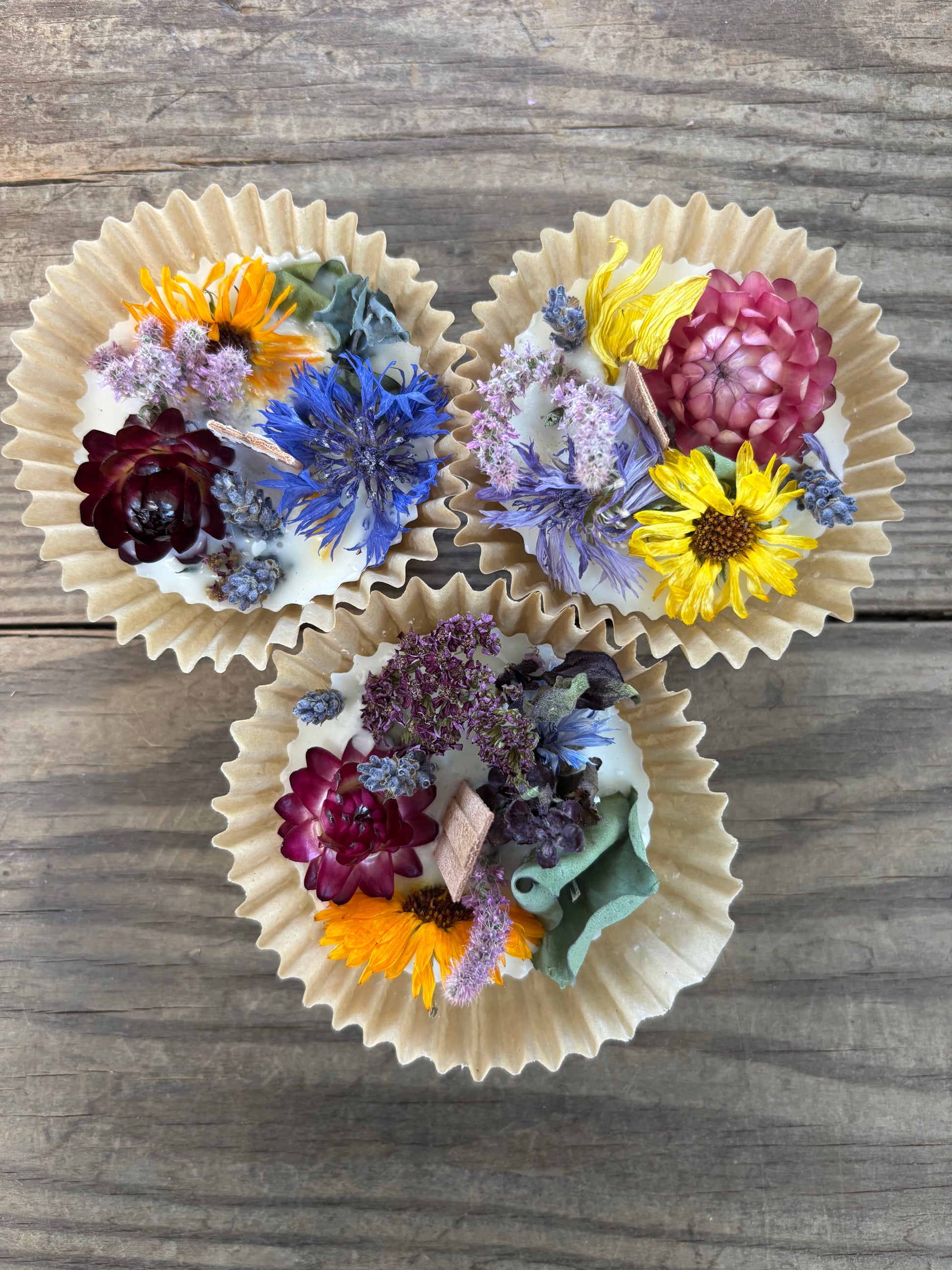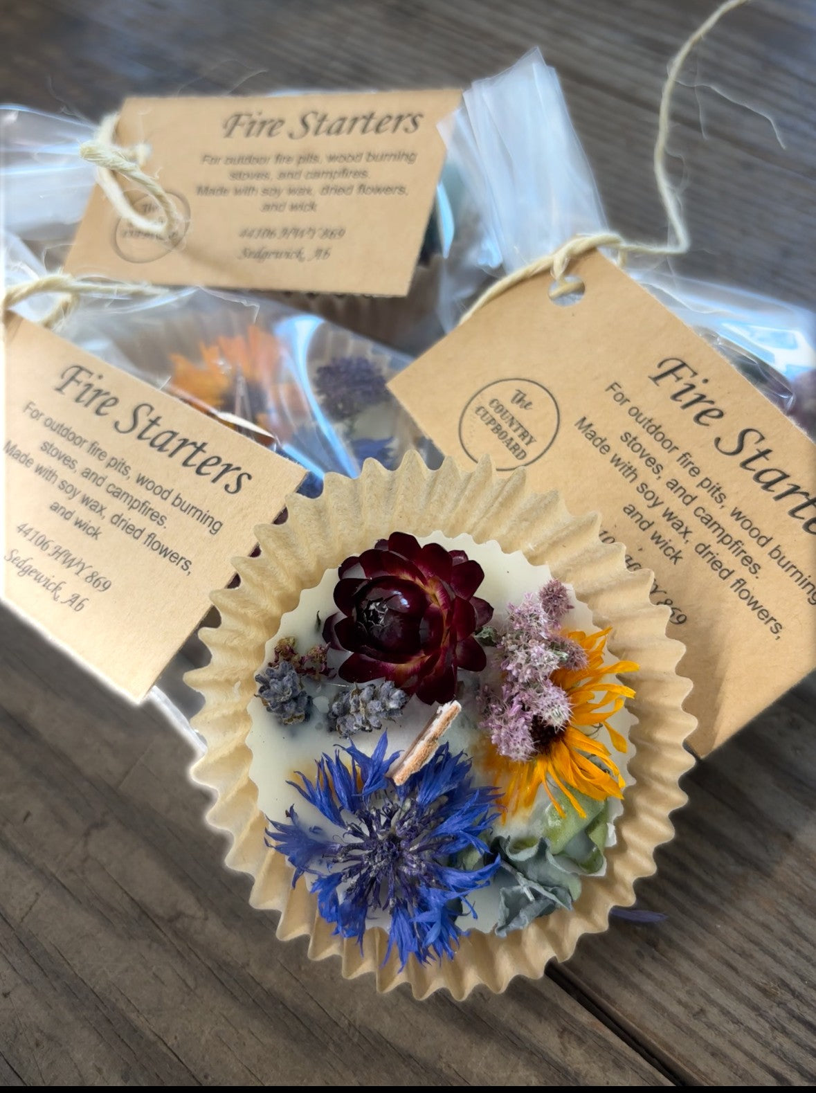 Beautiful fire starters, hand crafted with dried flowers from our cut flower garden, soy wax, and a wooden wick. Perfect for use in wood stoves and fire pits to help get your fire started.